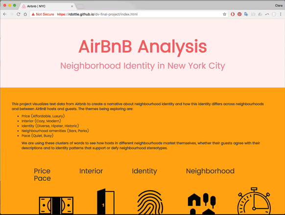 This project explores the ways in which neighborhood identities are expressed by Airbnb hosts and guests. These two user groups exist on the same platform, yet speak about the neighborhoods they host and stay in quite differently. To examine the nuances between both users' language, the project visualizes Airbnb text data mined from guest reviews and host listings in New York City. Interactive mapping of the words most frequently used across both groups paints a picture of neighborhood perceptions, and word associations based on categories further explore the nuances of language used.